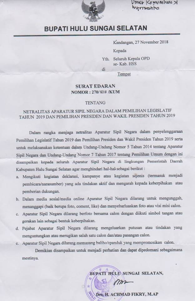 Surat edaran tentang Netralitas Aparatur Sipil Negara (ASN) dalam Pemilihan Legislatif Tahun 2019 dan Pemilihan Presiden dan Wakil Presiden Tahun 2019