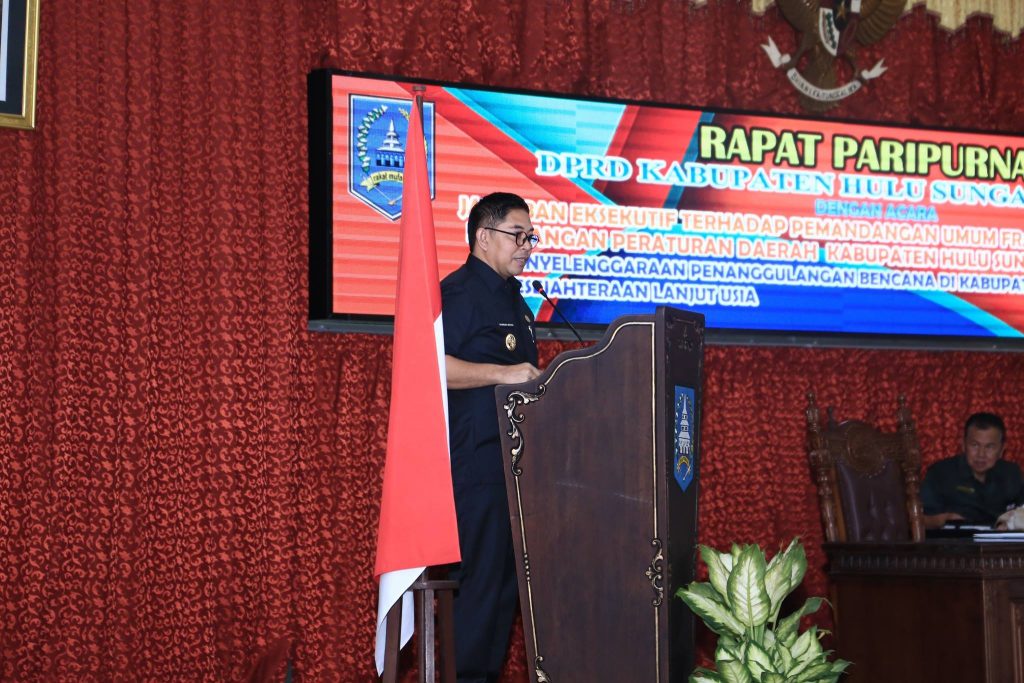 Dalam sambutan Bupati HSS yang dibacakan oleh Wakil Bupati HSS Syamsuri Arsyad mengucapkan terimakasih dan penghargaan kepada Fraksi – fraksi DPRD yang telah menyampaikan pertanyaan, tanggapan, saran dan dukungannya dalam Pandangan Umum beberapa waktu yang lalu terkait Rancangan Peraturan Daerah (RAPERDA) yang disampaikan oleh eksekutif yaitu RAPERDA tentang Penyelenggaraan Penanggulangan Bencana di Hulu Sungai Selatan dan Kesejahteraan Lanjut Usia.