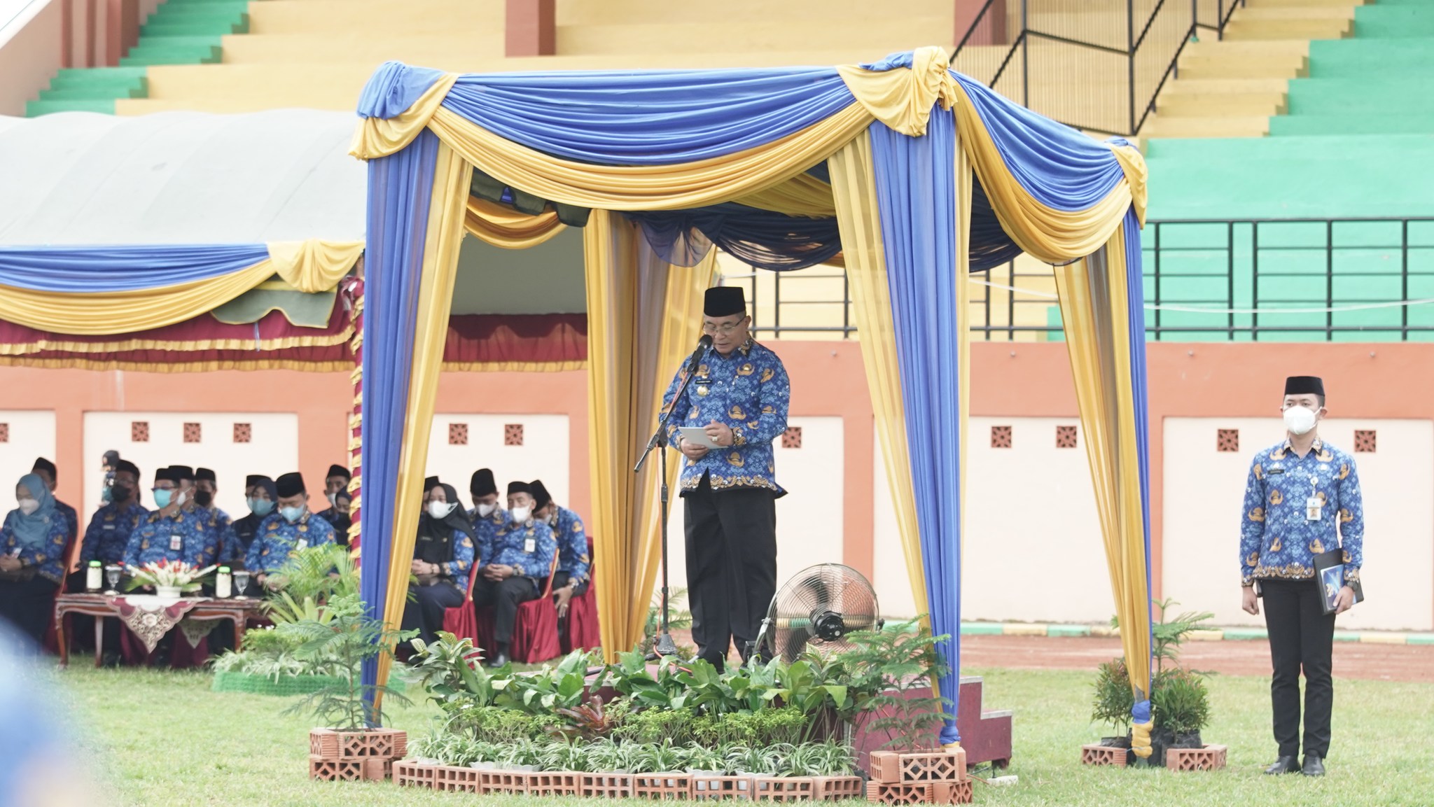 Bertindak selaku inspektur upacara Bupati HSS Drs. H. Achmad Fikry M.AP diikuti Sekretaris Daerah Kab. HSS Drs. H. Muhammad Noor M.AP, Kepala Kantor Kemenag HSS, serta para pejabat dan ASN di lingkungan Pemkab HSS.