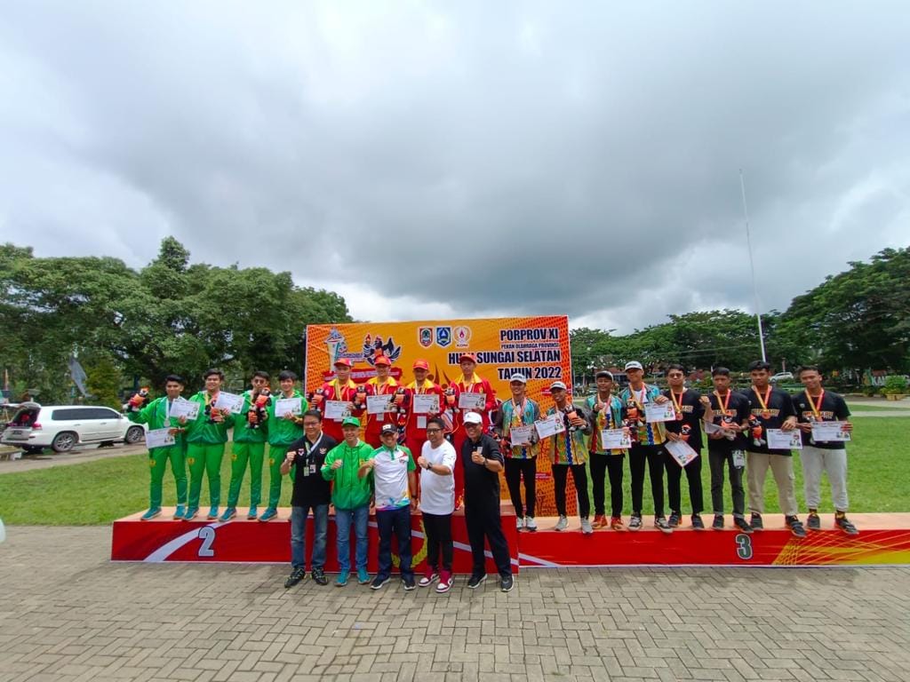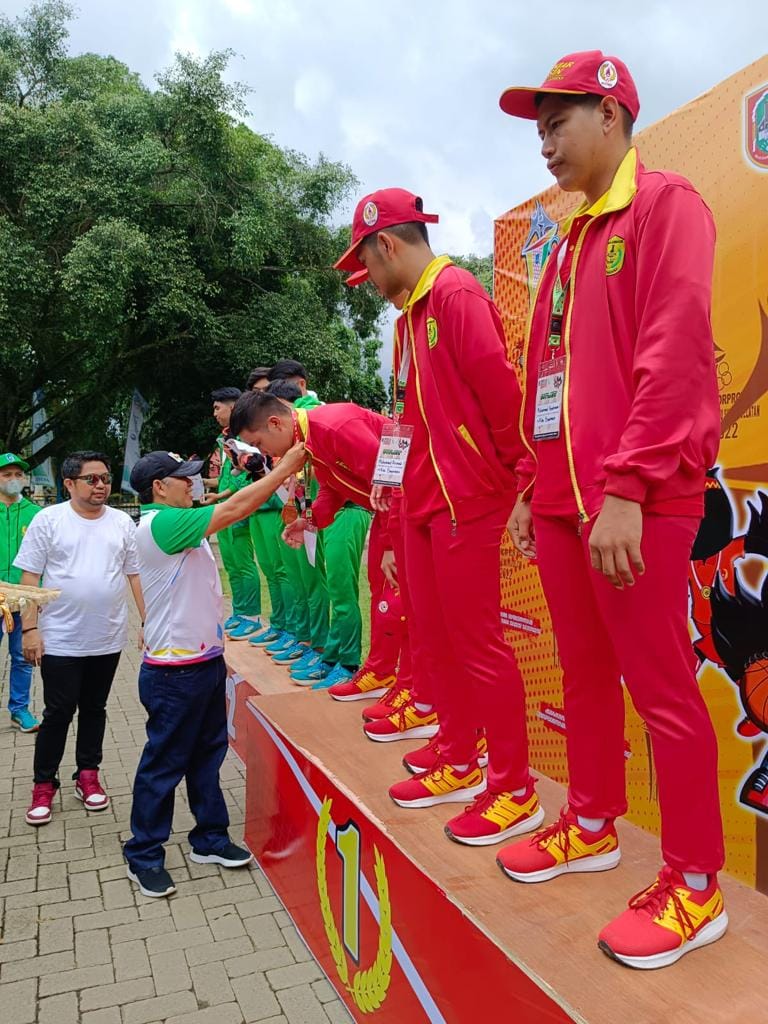 Wakil Bupati Hulu Sungai Selatan (HSS) Syamsuri Arsyad, S. AP, MA menghadiri dan kalungkan medali pemenang Cabang Olahraga (Cabor) Basket pada Upacara Penghormatan Pemenang di Lapangan Lambung Mangkurat Kandangan, Minggu, (06/11/2022).