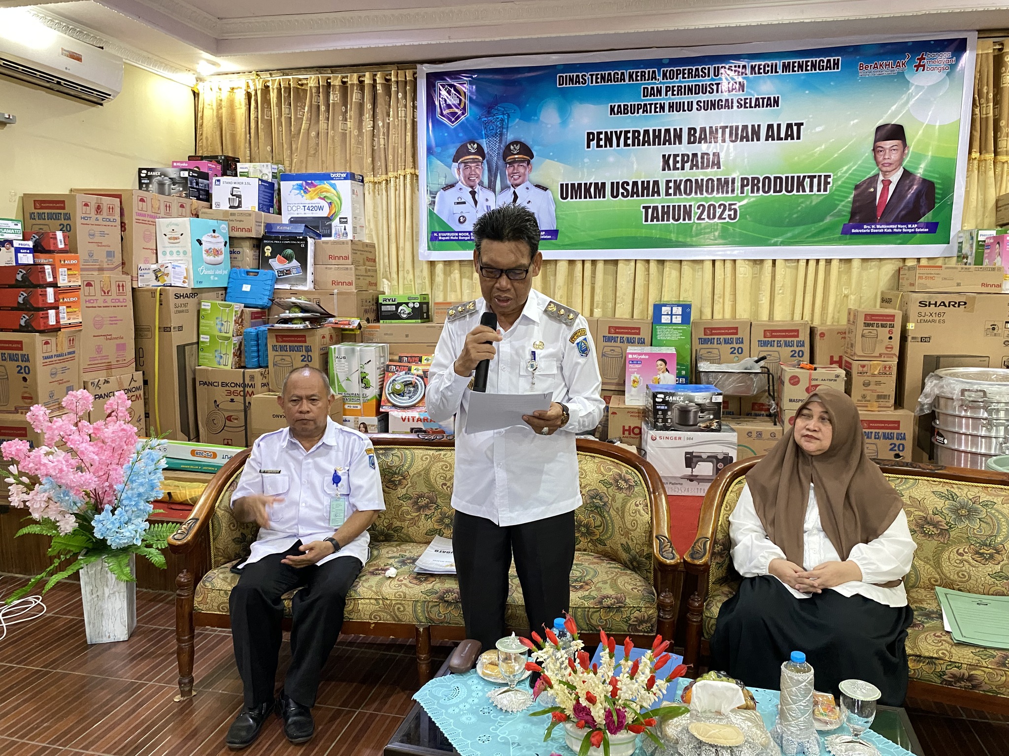 Acara penyerahan bantuan berlangsung di Aula Dinas Tenaga Kerja, Koperasi, Usaha Kecil Menengah dan Perindustrian (Disnakerkop UKMP) Kabupaten HSS, dan dihadiri oleh para pelaku UMKM penerima bantuan. Dalam sambutannya, Wakil Bupati HSS, H. Suriani, S.Sos, M.AP, menyampaikan bahwa program ini merupakan salah satu upaya strategis pemerintah daerah untuk mendorong kemandirian ekonomi masyarakat, khususnya bagi pelaku usaha kecil.