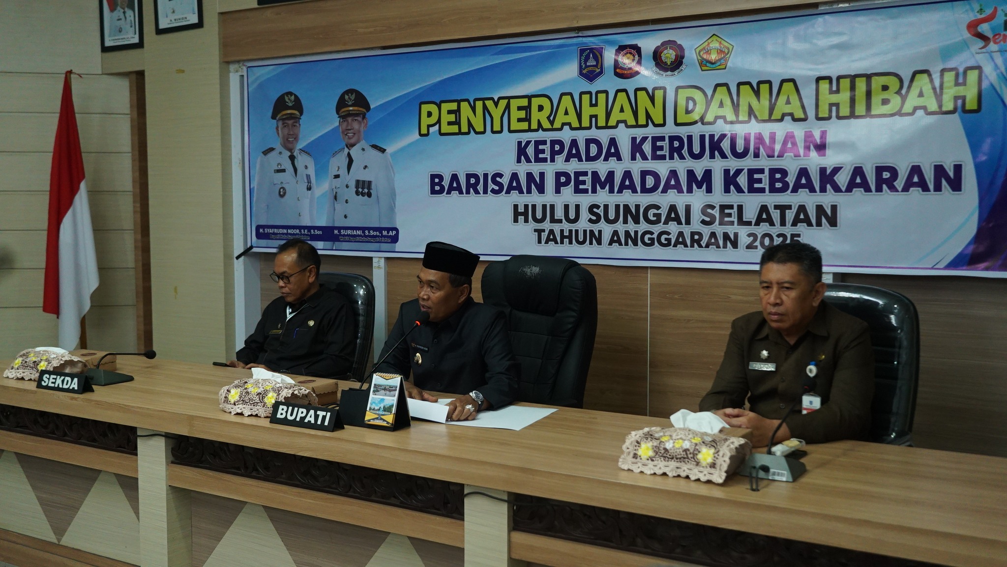 Sebagai bentuk dukungan nyata, Bupati Hulu Sungai Selatan (HSS), H. Syafrudin Noor, SE, S.Sos, didampingi Sekretaris Daerah Kabupaten HSS, Drs. H. Muhammad Noor, M.AP, secara simbolis menyerahkan dana hibah sebesar Rp. 1.900.000.000,- kepada Kerukunan Barisan Pemadam Kebakaran Hulu Sungai Selatan, dalam kegiatan yang berlangsung di Aula Rakat Mufakat Sekretariat Daerah (Setda) Kabupaten HSS. Rabu (21/05/2025).