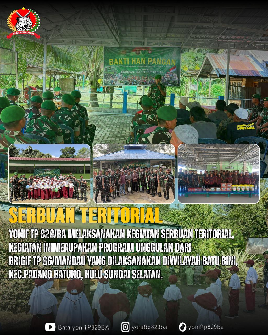 Padang Batung, 21 April 2026 – Dalam rangka mempercepat pembangunan daerah dan memperkuat kemanunggalan TNI dengan rakyat, Batalyon Infanteri Teritorial Pembangunan 829/ Bumi Antaludin melaksanakan program Serbuan Teritorial di wilayah Kecamatan Padang Batung.